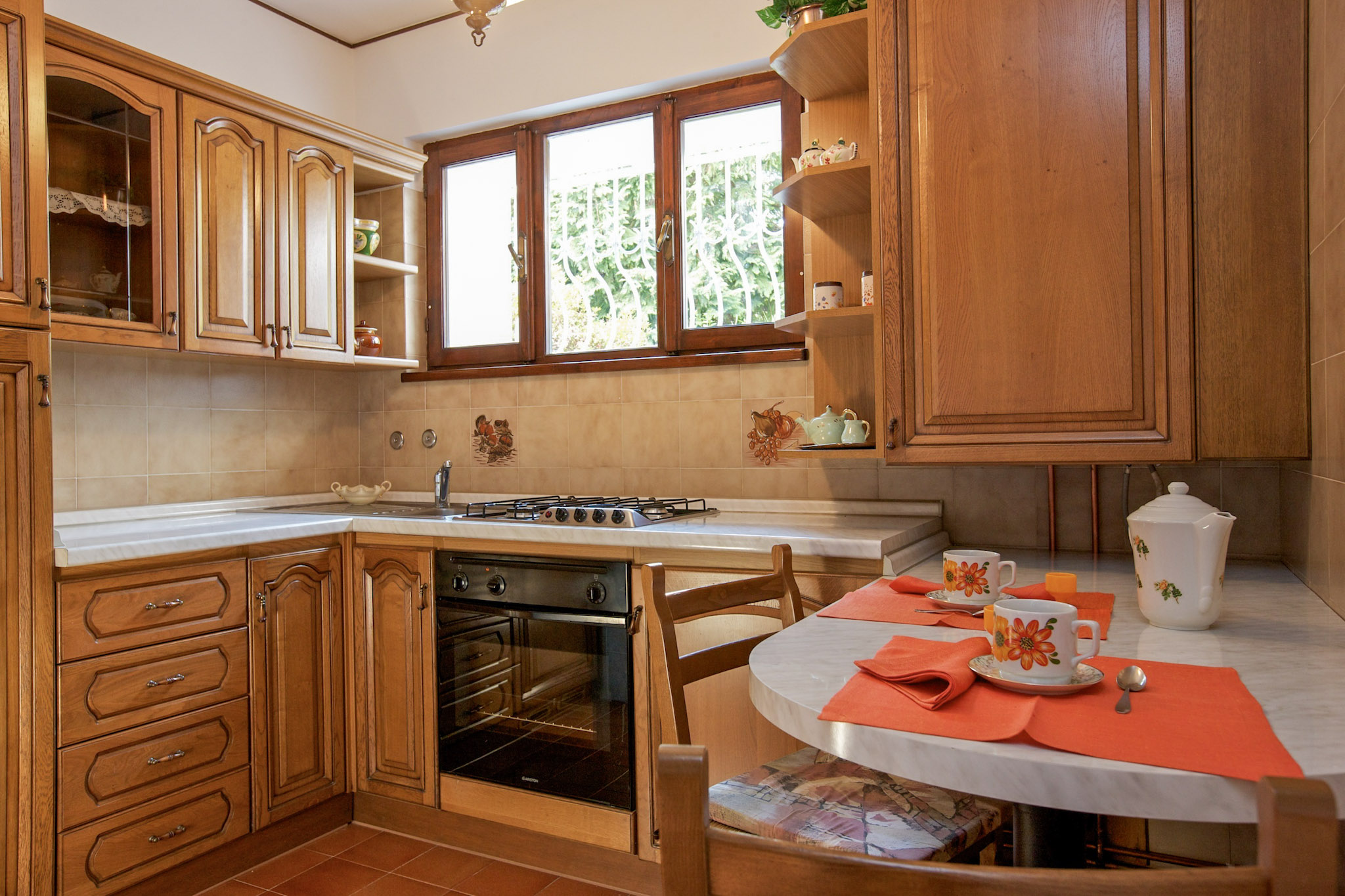 - Gut ausgestattete separate Küche mit 4-Flammen-Herd und Backofen