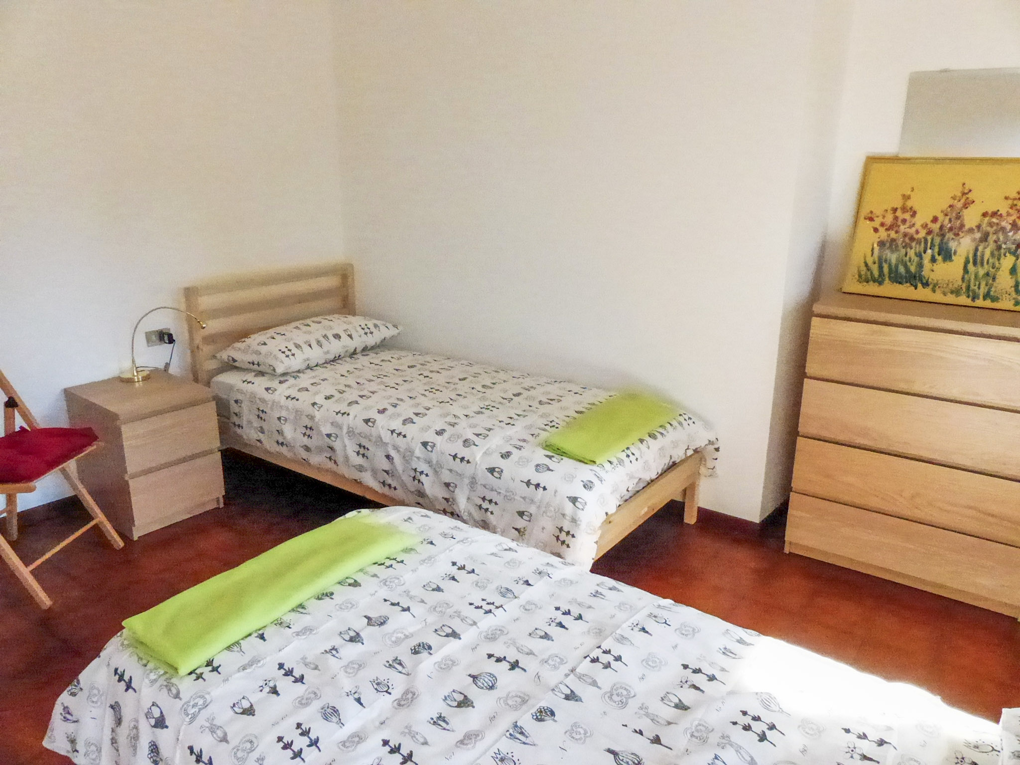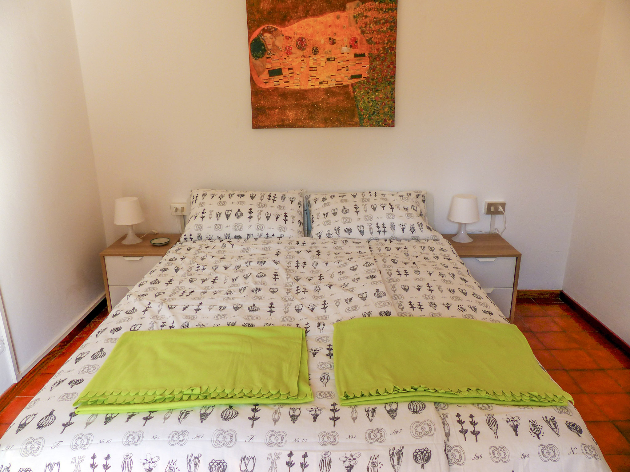 - 2. Schlafzimmer mit Deckenventilator, zwei Einzelbetten, die man auch nebeneinanderstellen kann (Matratzen jeweils 0,80 m x 2,00 m) und Ausgang auf den Balkon