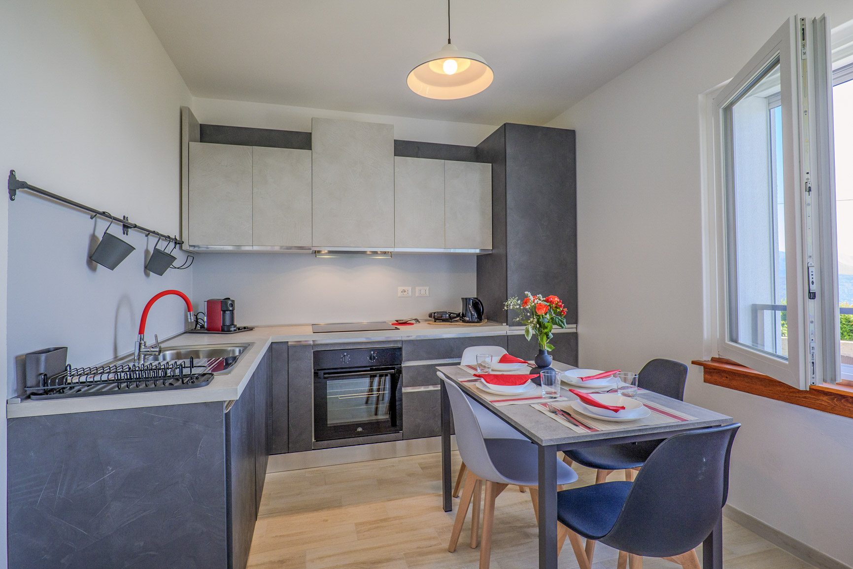 ■ Gut ausgestattete separate Wohnküche mit 4-Zonen-Cerankochfeld, Backofen, Mikrowelle und Geschirrspülmaschine sowie See- und Bergsicht