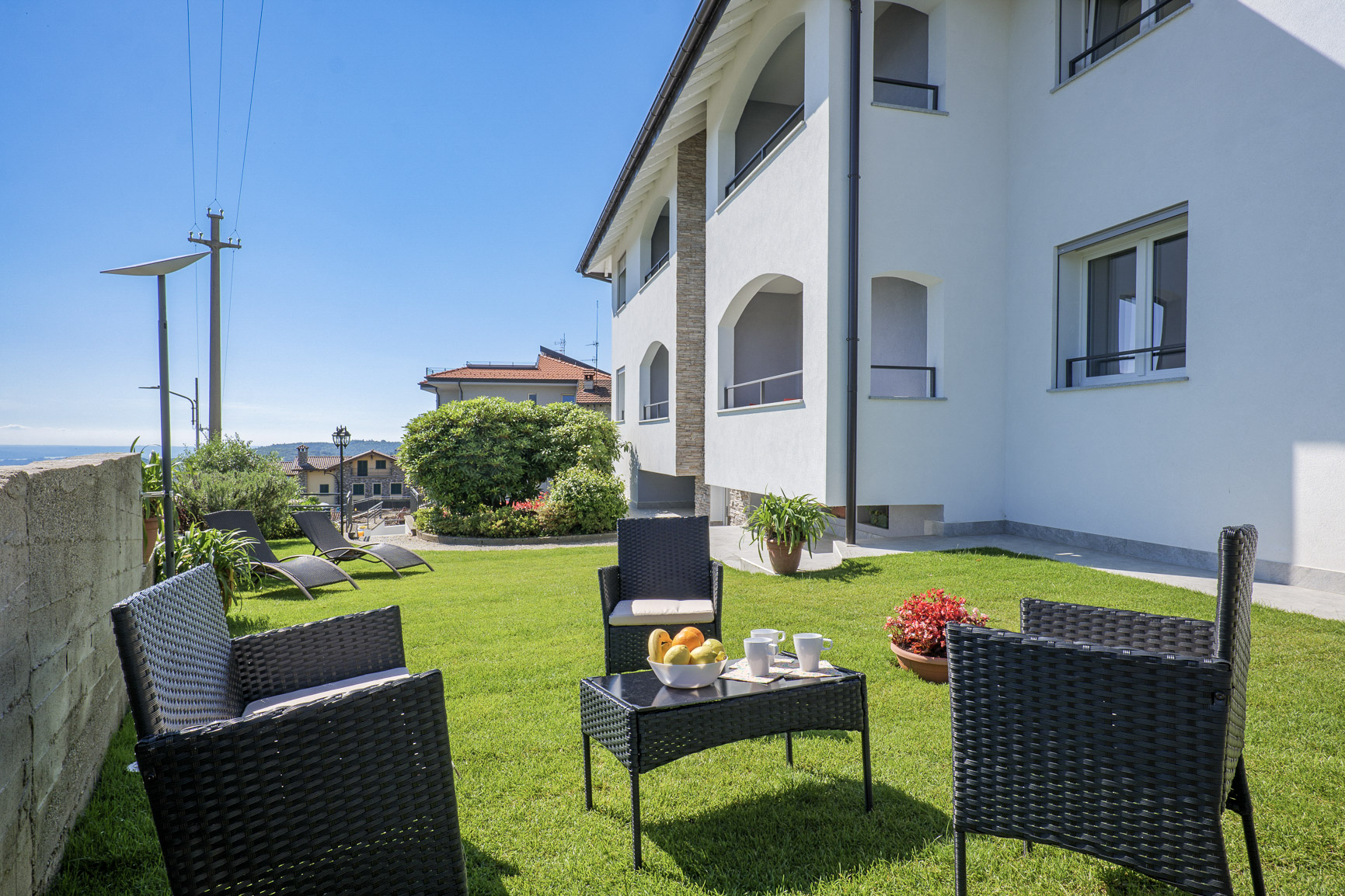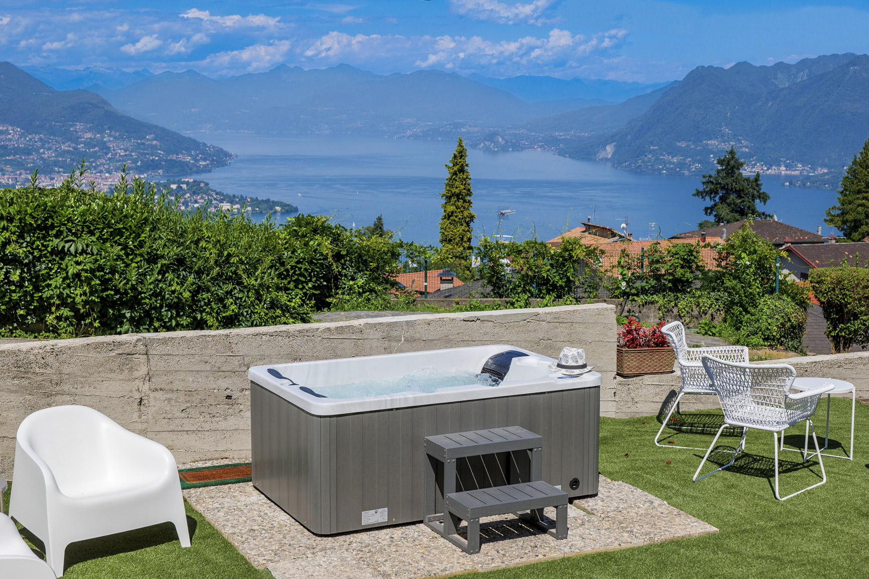 Wollten Sie schon immer mal zum Mond? Dann hätten wir vielleicht etwas für Sie, um den ersten Schritt in diese Richtung hier auf der Erde zu machen! Oberhalb von Stresa, im Ortsteil Levo gelegen, stellen wir Ihnen die wunderschöne „Residenza Luna“ vor. Am Hang des Mottarone gelegen, schweben Sie hier in herrlicher Aussichtslage über dem See und sind definitiv dem Himmel näher. Die insgesamt neun Wohneinheiten wurden bis zum Frühjahr 2024 komplett renoviert und mit Liebe zum Detail geschmackvoll modern eingerichtet. Jede Wohnung verfügt über mindestens einen privaten Außenbereich, teilweise mit fantastischer Sicht auf den See, die Borromäischen Inseln und die Berge. Wer sich gern sportlich betätigt, findet hier zahlreiche Möglichkeiten für Wander- oder Fahrradtouren auf gut markierten und ausgebauten Wegen. Auch Golfspieler kommen auf ihre Kosten: der Golfclub „Alpino di Stresa“ ist nur knapp 3 km entfernt, und der mit Abstand schönste Golfplatz am Lago Maggiore überhaupt, der „Golf des Iles Borromees“, nur ca. 7 km. Nach einem ereignisreichen Tag können Sie dann in den Whirlpool (1,85 m x 1,20 m und witterungsbedingt geöffnet vom 15.03. bis 15.11. eines jeden Jahres) eintauchen und sich im gemeinschaftlichen Außenbereich (Kunstrasen) auf einem der Liegestühle entspannen. Danach bei einem Glas Wein den beeindruckenden Ausblick von Ihrem Balkon oder Ihrer Terrasse aus genießen - wenn sich das nicht nach Urlaub und Erholung anhört, was dann? Da braucht man eigentlich gar nicht mehr zum Mond, wenn man doch schon den Himmel auf Erden haben kann! Alle Wohnungen verfügen über einen kostenlosen WLAN-Internetzugang. Somit können Sie auch den Rest der Welt mit Ihren Urlaubseindrücken neidisch machen. In ca. 200 m Entfernung befinden sich eine Bar und in ca. 3 km zwei Restaurants. Die herrliche Seeuferpromenade von Stresa mit einladenden Restaurants, Cafés, Bars und Geschäften, Einkaufsmöglichkeiten, dem öffentlichen Strand und die Schiffsanlegestelle befindet sich in ca. 6 km Entfernung. In einem separaten Häuschen steht Ihnen eine Waschmaschine und ein Wäschetrockner zur gemeinschaftlichen Nutzung zur Verfügung. Auf dem privaten Parkplatz am Haus A gibt es vier kostenlose Ladesäulen für Elektroautos und E-Bikes. Ihr Fahrzeug können die Mieter des Hauses A entweder dort abstellen oder direkt vor dem Grundstück. Für das Haus B werden die kostenfreien Parkplätze in ca. 20 m Entfernung genutzt, die Mieter der 1-Zimmer-Studiowohnung können bis zum privaten Garten zum Be- und Entladen heranfahren. Jugendgruppen unter 25 Jahren sind aufgrund schlechter Erfahrungen nicht erlaubt.