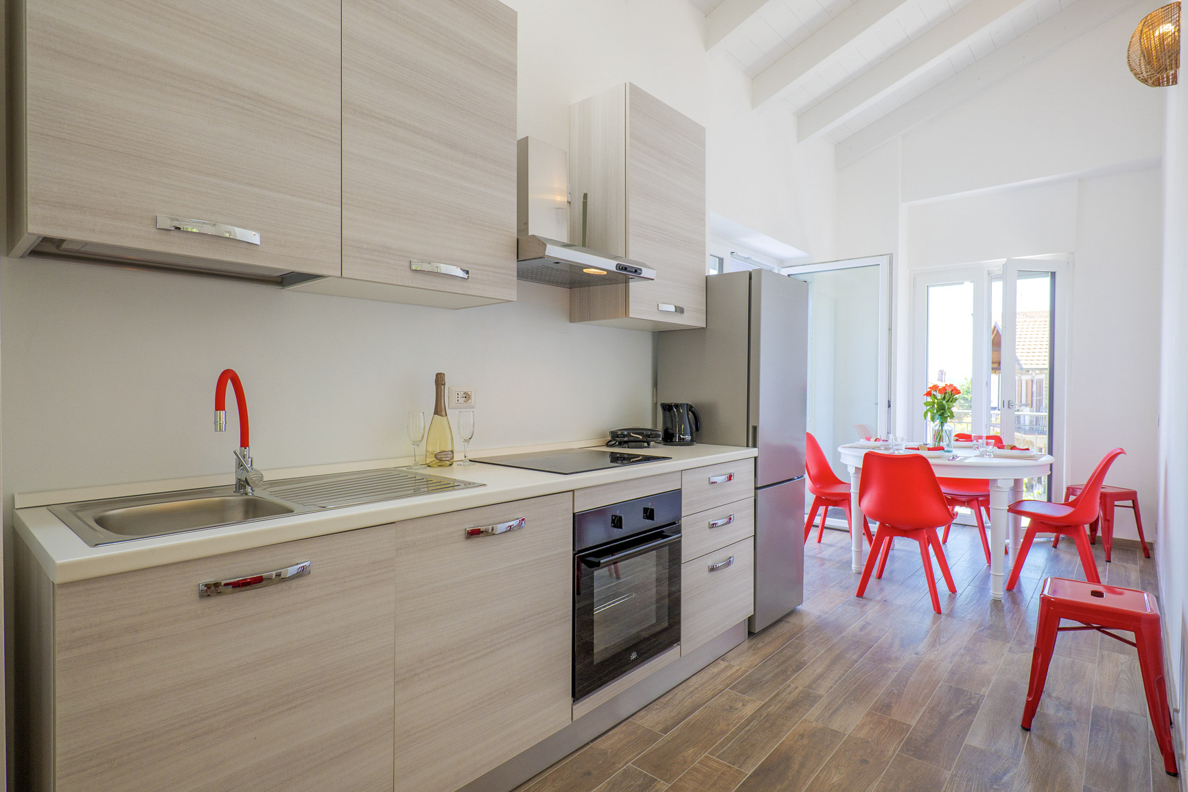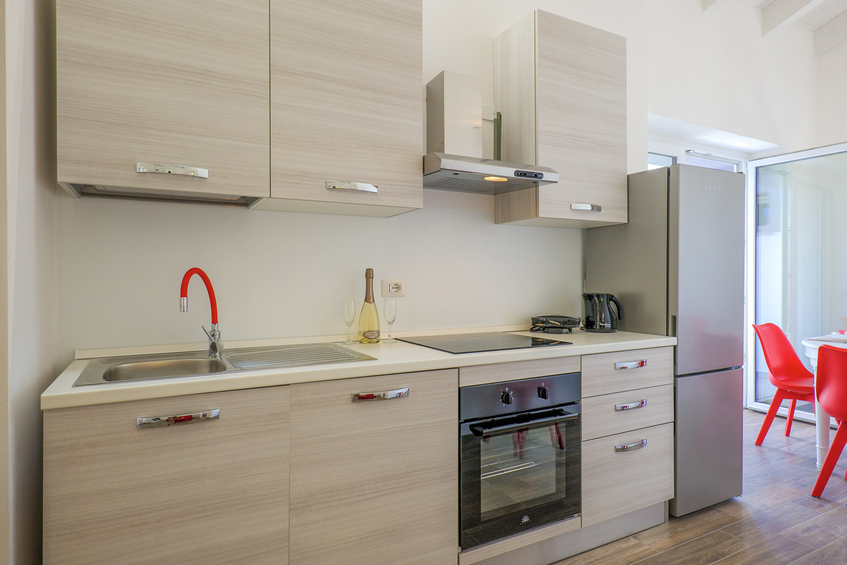 ■ Gut ausgestattete Küchenzeile mit 4-Zonen-Cerankochfeld, Backofen, Mikrowelle und Geschirrspülmaschine